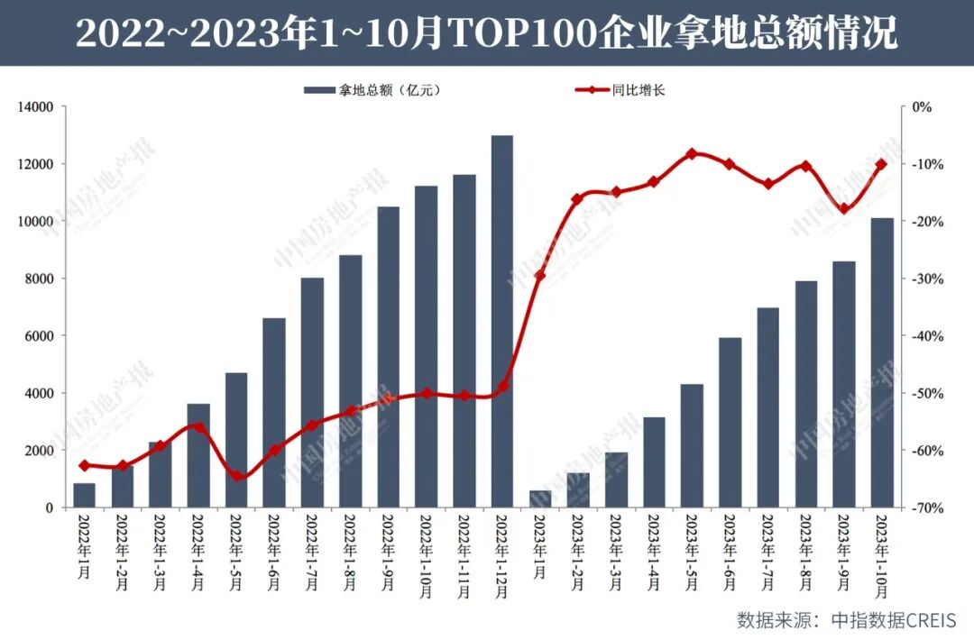 市场和融资局势依然影响着房地产企业的投资策略。11月1日,多家房企机构发布房企拿地报告。其中,中指研究院发布《2023年1~10月全国房地产企业拿地TOP100排行榜》,榜单显示TOP100企业在今年前10月拿地总额为10107亿元,同比下降10%,降幅较上月收窄7.9个百分点。TOP100房企门槛值为28亿元,较上年同期下降8亿元。TOP50强呈现出活跃态势,在一线热点城市不断新增土地储备。中指研究院监测数据显示,受热点城市热点地块影响,TOP50强房企拿地总额环比增长59.6%,其中中海、华润、保利、中铁建等拿地规模较高,单月拿地金额超90亿元;绿城、龙湖等混合所有制企业和民企亦有投资,部分企业在这些城市亦展现出了逆势扩储的能力。