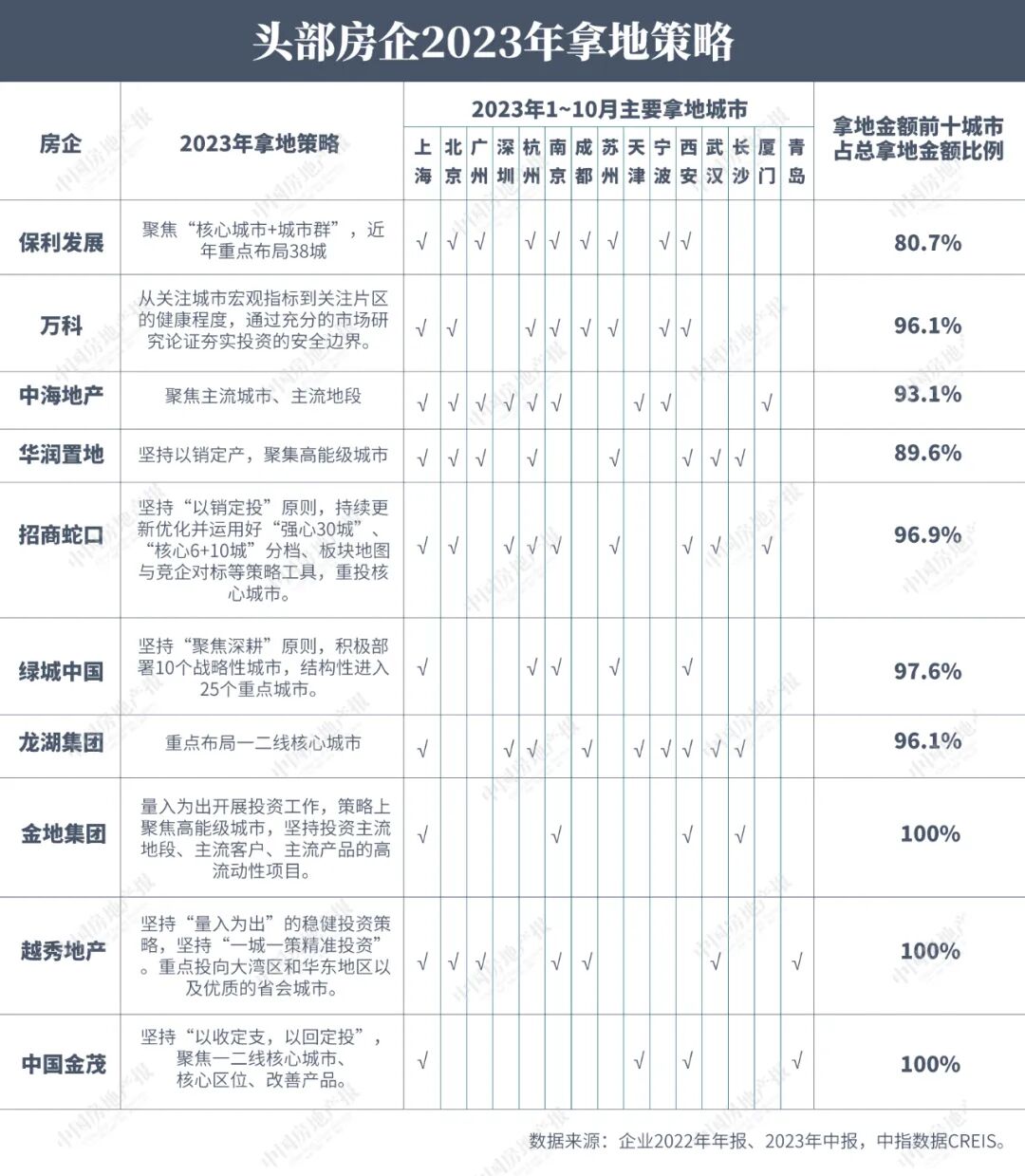 从新增货值来看,中海地产、保利发展、华润置地占据榜单前三位。2023年1~10月,中海地产以累计新增货值2127亿元占据榜单第一;保利发展、华润置地紧随其后,累计新增货值规模分别为1644亿元和1551亿元。这背后与中海拥有较为充足的现金流和低负债率相关。10月25日,中海发布的三季度财报显示,今年前9月,中海合约销售额2390.3亿元,同比上升18.7%,是少数实现同比增长的房企之一。截至9月30日,其银行结余及现金为1155.3亿元,净借贷比率为39.7%。位于行业低区间。早在2023年中期业绩会上,中海地产行政总裁张智超就表示,在投资策略方面中海会坚持“三个主流”,即投资主流城市、主流地段、主流项目,同时也会严守投资纪律、投资刻度。在城市拓展方面,2023年1~10月,10家头部房企中有7家房企在前十城市拿地金额占比超过95%。从出现频次看,一线城市中上海和北京出现次数较多,分别为10次和6次;二线城市中,杭州、南京、西安分别出现7次、7次和8次。比如中海地产,年内在一线城市就拿下的3个百亿级地块。