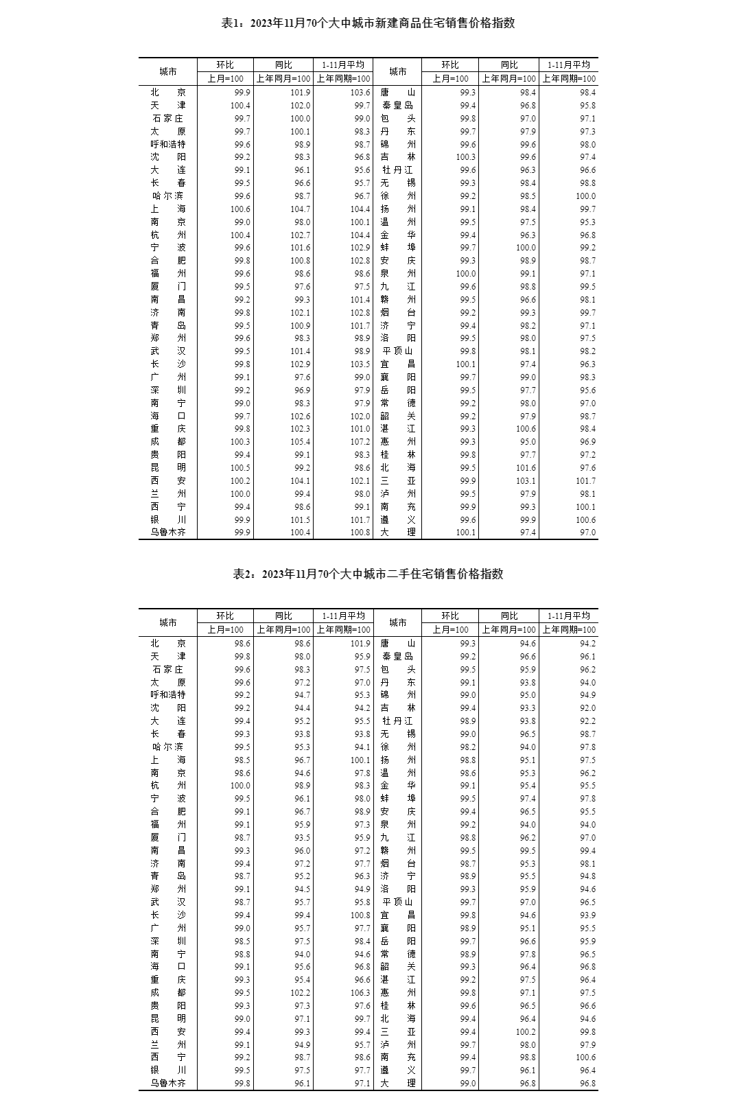 12月15日,国家统计局发布2023年11月份70个大中城市商品住宅销售价格变动情况,11月份,70个大中城市商品住宅交易规模有所上升,销售价格环比总体延续降势、同比有涨有降。