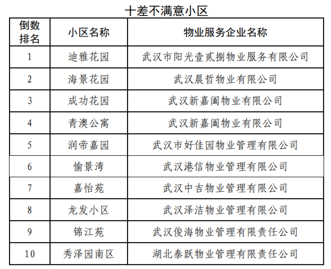依据《武汉市物业管理条例》《武汉市住宅小区物业服务质量考评办法》以及市治庸办关于组织对全市物业服务企业进行评议的相关要求,我局在全市组织开展了 2022 年住宅小区物业服务评议工作,通过业主线上、线下评价,结合街道、社区、业主委员会和区房屋主管部门的评价意见,汇总形成综合评议结果。现将 2022 年全市物业服务质量考评“十优满意小区”“十差不满意小区”、各区排名靠前靠后小区名单予以公告。