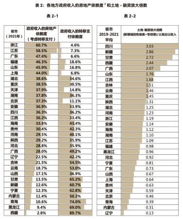 如表2-1,2021年政府收入的房地产依赖度超过40%的省份有6个,全部是东部较发达地区,从高到低依次是浙江(60.7%)、江苏(58.5%)、广东、福建、山东和上海(44%),同时这6省份对中央转移支付的依赖度均低于20%,财政“自给自足”能力很强。