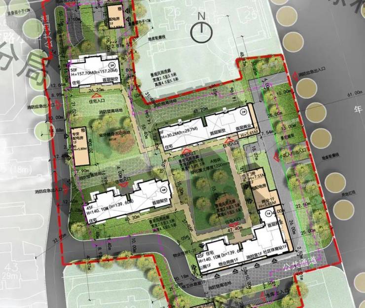 根据公示显示,项目将建设4栋住宅,其中1、4号楼45F,3号楼为50F,2号楼为小高层仅11F,1号楼首层还包括部分商业,2、3、4号楼首层均为架空。规划建筑密度19.80%,容积率4.47,绿地率30.0%;总户数501户,机动车位709辆(均为地下停车位),非机动车位410辆。