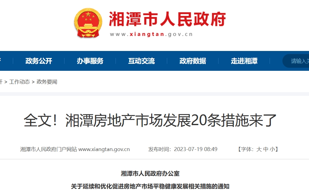 7月19日,湘潭市政府发布《关于延续和优化促进房地产市场平稳健康发展相关措施的通知》,对《湘潭市进一步促进房地产市场平稳健康发展的若干措施(试行)》有关内容进行优化,共包括20条措施。